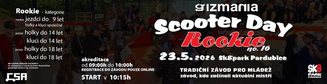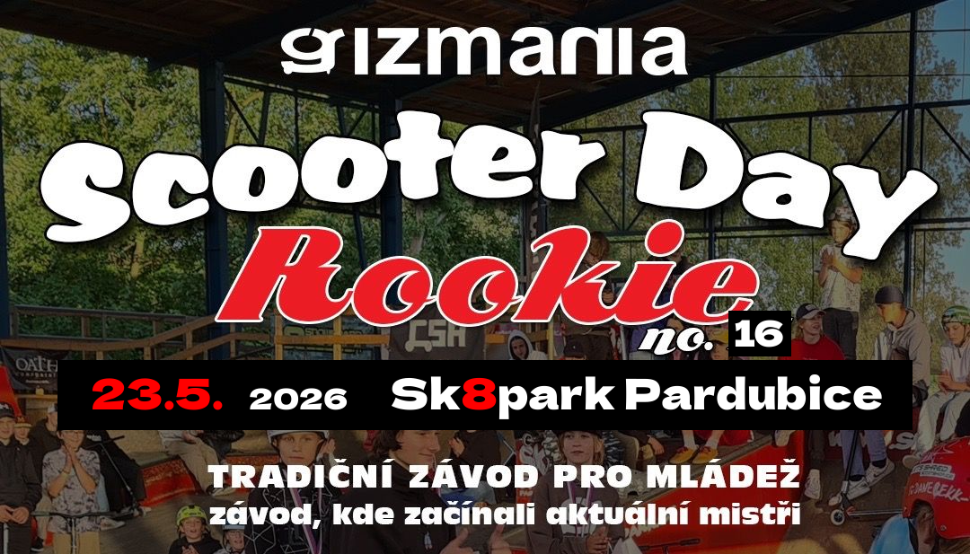 Scooter Day Rookie 2026 z jedinečné série jarních závodů ve skateparku Pardubice určených zejména mladším jezdcům. Již 16. pokračování populárního GIZMANIA Scooter Day Rookie - tradičního závodu, kde začínali aktuální mistři.